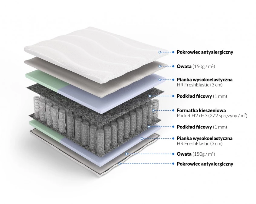 Do tego materaca polecamy stelaże bez regulacji. Materace pocket należy użytkować ze stelażami, których prześwit listew nie jest większy, niż 5 cm.