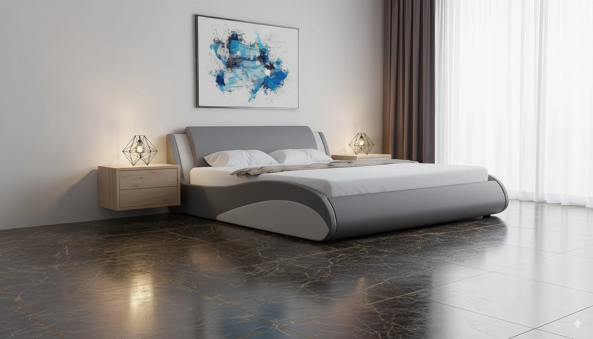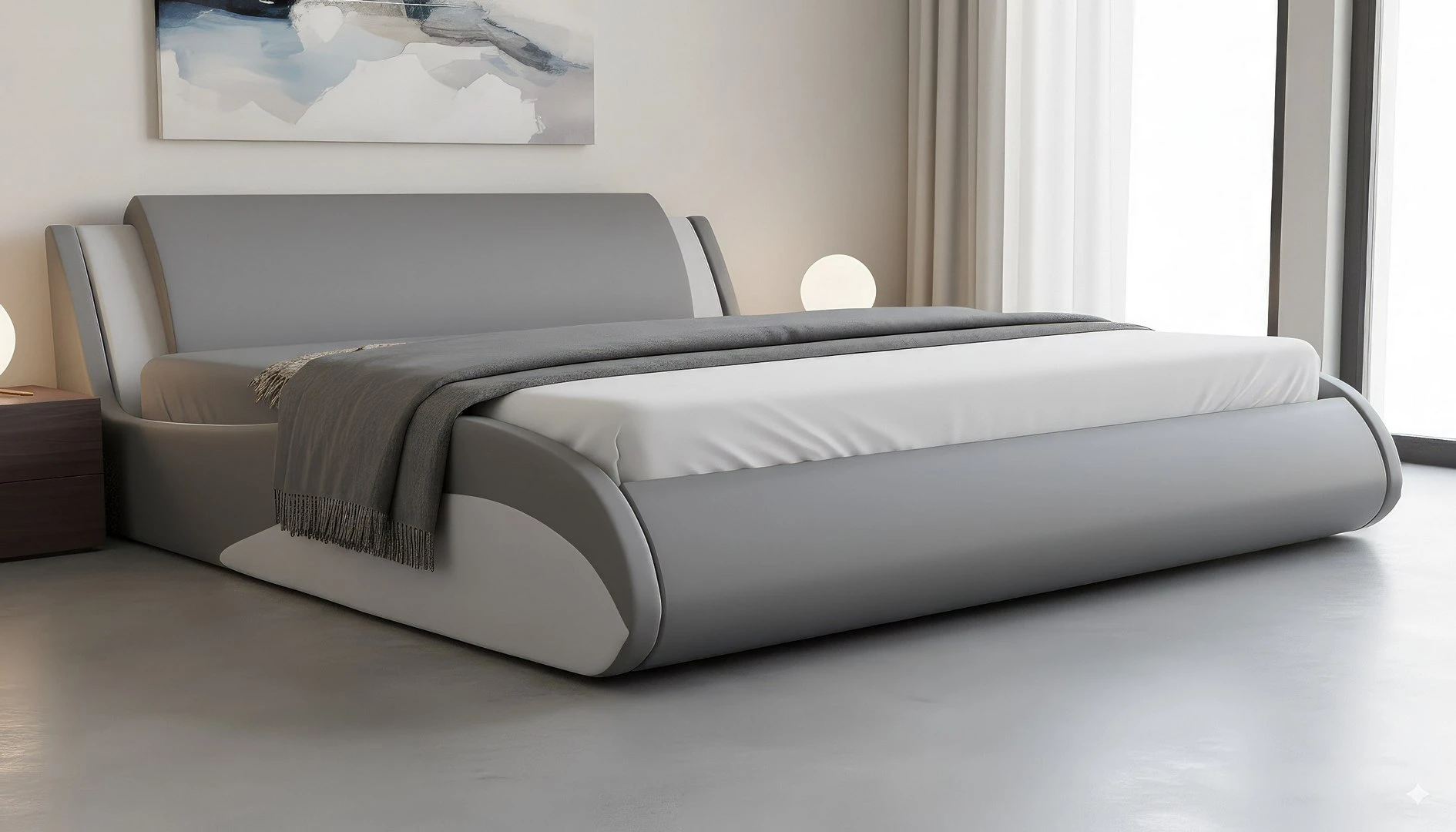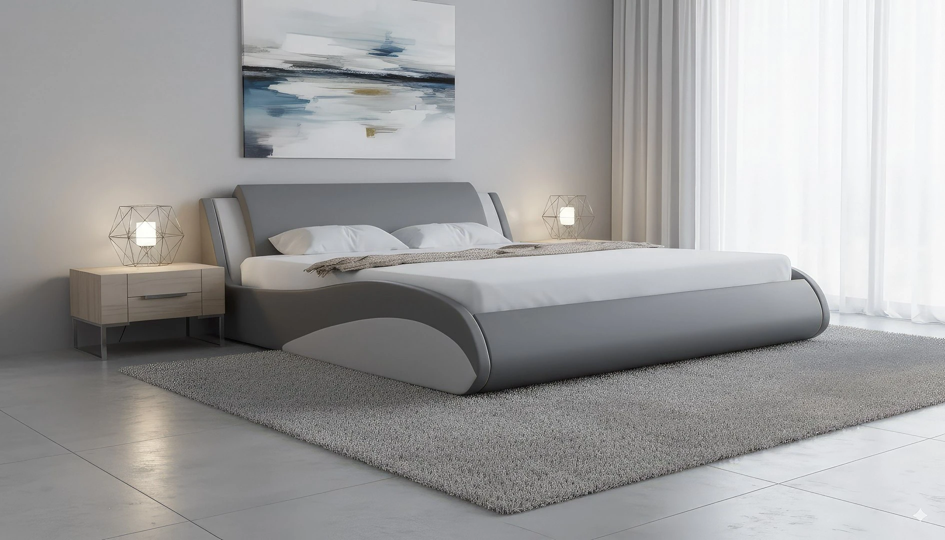 - Łóżko tapicerowane tkaniną.